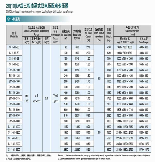 S11-M Series 20 (10) kV voltage level dual-phase oil-immersed distribution transformers